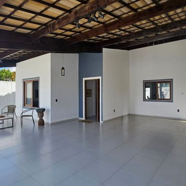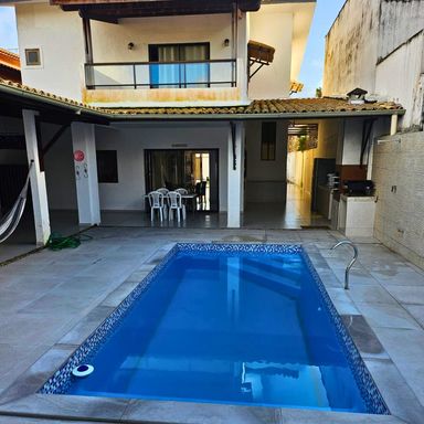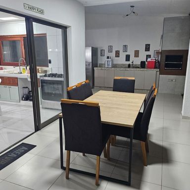 Um dos grandes destaques do imóvel é a ampla área de lazer em formato “L”, perfeita para receber amigos e familiares. O espaço dispõe de churrasqueira, forno de pizza, armários planejados novos, área para jogos e uma suíte confortável para hóspedes, equipada com ar-condicionado split.