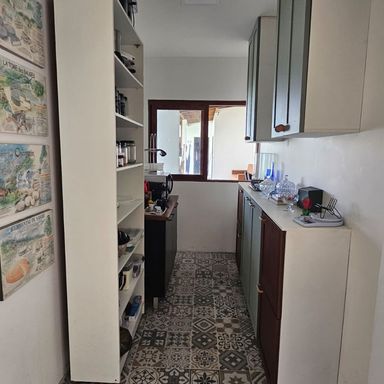 Ao lado da cozinha, um espaço inteligente de apoio com armários em MDF permite o armazenamento organizado de utensílios, eletrodomésticos e alimentos. O ambiente ainda conta com lavabo e área de serviço bem distribuída.