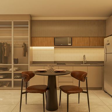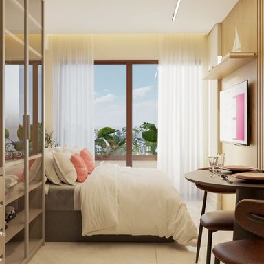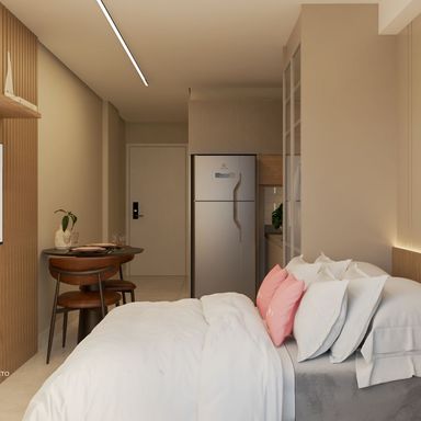 O studio possui 24,59 m² muito bem distribuídos, aproveitando cada espaço de forma funcional. O ambiente integrado cria uma sensação de amplitude e modernidade, ideal para quem busca praticidade no dia a dia, seja morando sozinho, seja utilizando o imóvel como investimento para locação por temporada ou mensal. A planta compacta e versátil permite diferentes possibilidades de organização e decoração, tornando o espaço ainda mais atraente.